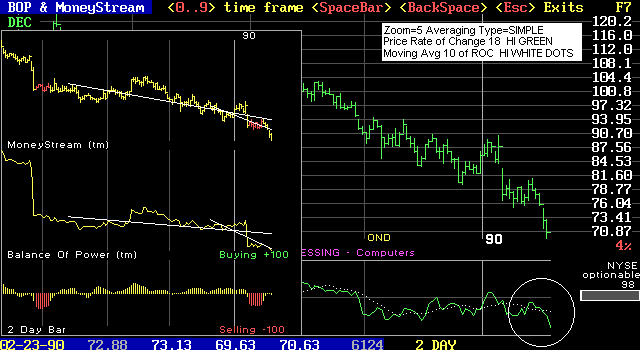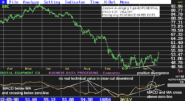 Notice that back in mid-June of 1990 as price had already begun to top out, MACD is below its moving average and breaking down below the zero-line. Just days later, MACD’s moving average (hi red dots) also breaks below the zero-line. Now granted, this occurs with the stock selling at about 85, when just a month before DEC was trading up around 95. Which is to say that MACD is more of a lagging indicator, as opposed to one that typically leads price.