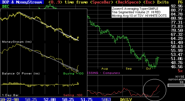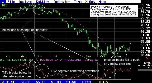 On our daily chart of DEC, you will notice that price dropped below its 30-day moving average (HI WHITE DOTS) during the middle part of June — right around the same time TSV and its moving average broke down below the zero-line. Both are indications of a change taking place in the character of the trend. As a result, DEC’s price declines from around 85 to a low of about 45 over the following four months. During which time, TSV remained well into negative territory, flatly refusing to contradict the action in price. This is to say that during this period from June through October, TSV did nothing more than simply confirm the downtrend intact. It is not until the later part of October before TSV (HI RED) crosses back above the zero-line into positive territory. This is an early sign of a change in character. Just as TSV alerted us to technical deterioration taking place back in June (1990), by 12/3/90, TSV was signaling that a short to intermediate term bottom was likely forming. Both of the latest two price pullbacks, coming in early and late November, failed to push TSV below the zero-line. The backing-and-filling action during October and November was accompanied by a TSV showing first, a pronounced dry-up in selling pressure and second, an actual changeover to accumulation.