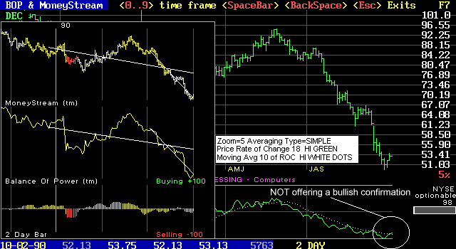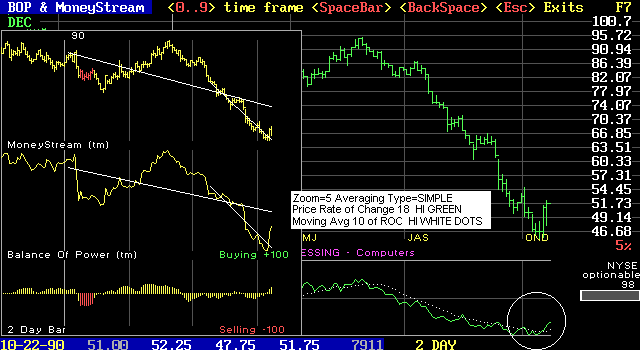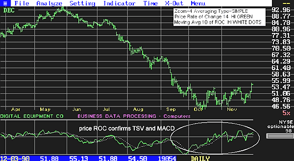 Looking at module 1 on our chart through 10/2/90 we see that TSV has again crossed up through its moving average. However, a quick glance at indicator module 2 shows us that our rate of change indicator is NOT offering a bullish confirmation. Therefore, our short trade remains in force. Scrolling ahead one day at a time, we see that by 10/15, DEC has fallen to a low of