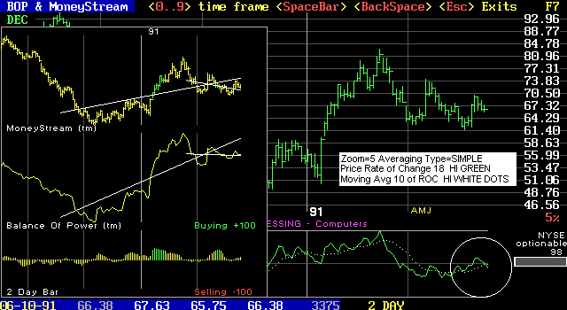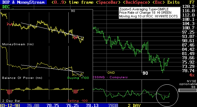 In Friday’s report we were working with a daily chart of Digital Equipment (DEC) clipped back to 12/3/90. You will recall that we outlined three different indicator modules for the purpose of this example. We’ve just about covered everything pertinent to Module #1, so let’s move on to Indicator Module #2.
