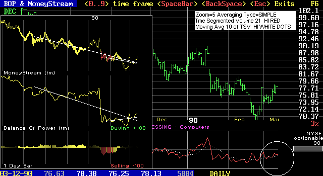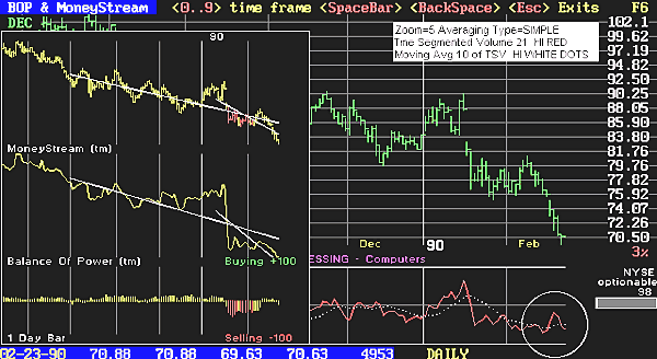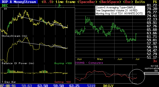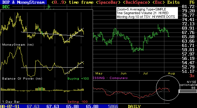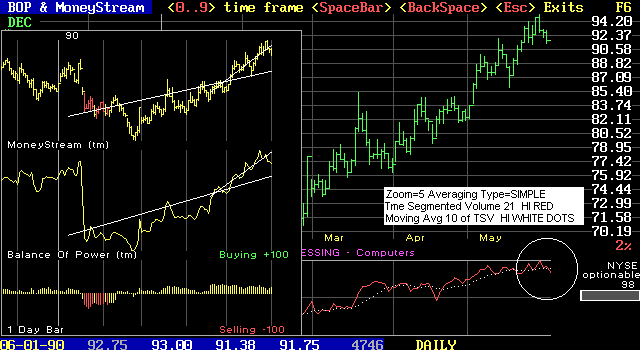 Pull up a daily chart of DEC and clip-back the ending date to 2/23/90. Now let’s create two different indicator modules to be used in conjunction with each other. For the first one, set-up a daily chart with a zoom=5. Calculate a Time Segmented Volume (TSV) of 21 (HI RED) with a moving average of 10 (HI WHITE DOTS). Average Type = Simple.