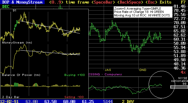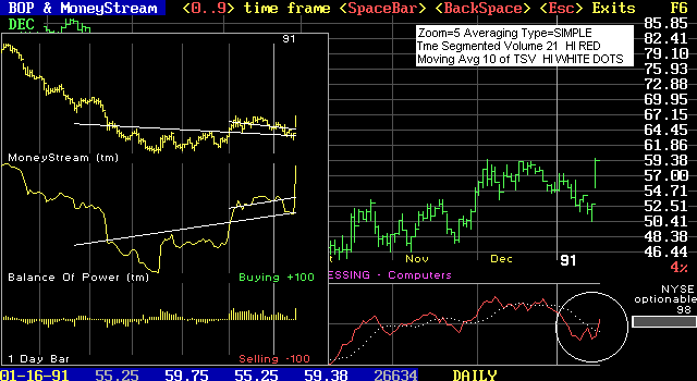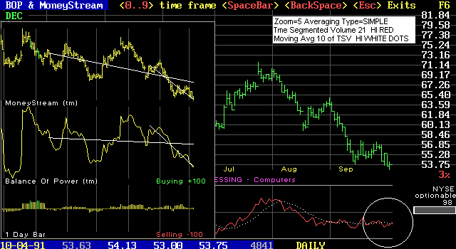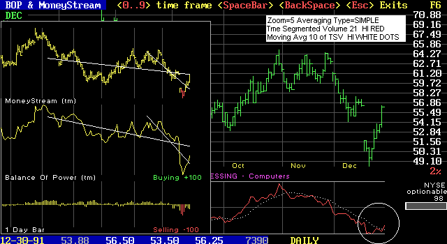 Following the buy signal, DEC rallies impressively to a high of $65 a share by the end of October. However, during the first days of November, DEC pulls back rather sharply from an overbought condition. On 11/5/91, with DEC now trading at 59, our first indicator module (daily chart with TSV) registers a negative crossover. But a quick check of our second indicator module fails to confirm, therefore we have no valid sell signal, as yet.