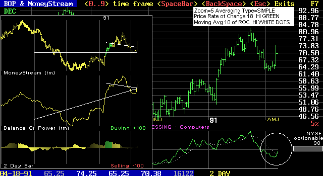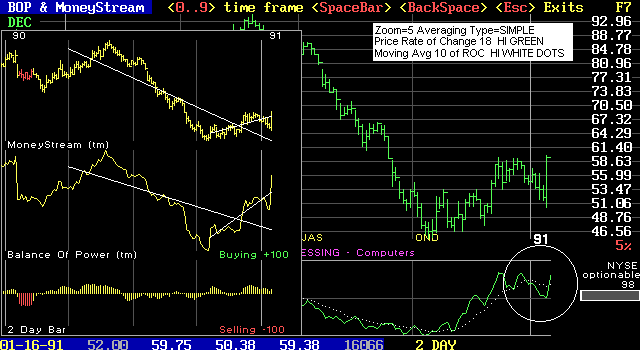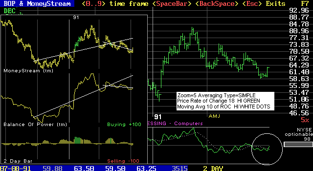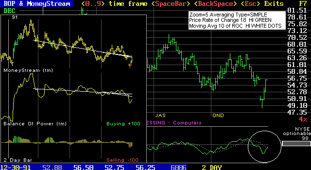 Module 1 alerts us to another possible sell signal on 11/21/90, but like before, a quick check of module 2 fails to confirm the weakness. By 11/26/90, DEC is at $48 a share, module 1 is clearly flashing sell, but the ROC indicator in module 2 remains comfortably above its moving average. Still no change in our position. As we scroll forward from this point, we see that DEC finally begins to move higher, closing at a high of 59 1/4 on 12/18/90. Our sell signal occurs some two weeks later on 1/4/91 at 56 1/4.