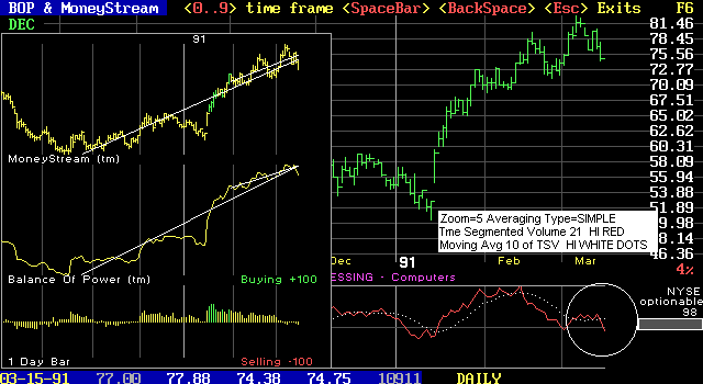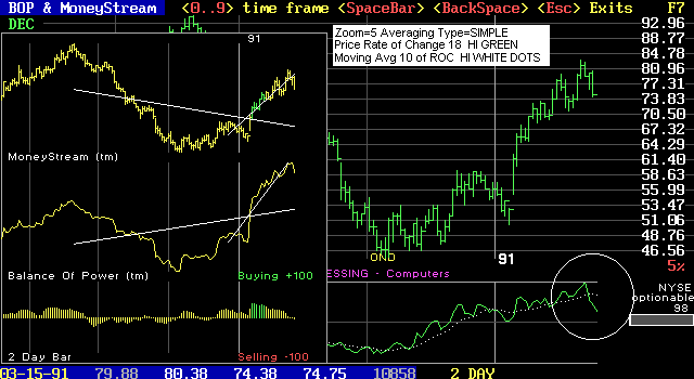 You will recall that in our last installment, our chart of DEC is updated through 1/16/91 and we have just initiated a LONG position at 59 3/8. Now let’s slowly scroll forward one day at a time and watch the results of our trade unfold. Check each indicator module frequently for a possible closeout signal. Stop when you get to 2/15/91. Notice the TSV in ‘module 1’ has crossed decisively down through its moving average. Now let’s check our indicator ‘module 2’ for confirmation. Module 2 fails to show similar action, having not violated its moving average. According to our rules, we must continue to hold our long position in DEC. Now, pull-up ‘module 1’ again and resume scrolling forward through time. A sell signal is finally rendered on 3/15/91 with DEC trading at 74 3/4. This is our cue to closeout our long position, which was originally established on 1/16/91 at 59 3/8 and open a new short position right here at 74 3/4.