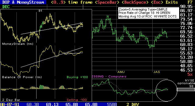 Using both indicator modules and going back in time once again to the summer of 1991, we see that we are short Digital Equipment (DEC) as of the date 6/10/91 at a price of 66.38. Less than one month later, on 7/8/91, DEC pops to the upside, closing at 63.25, thereby triggering crossovers in both our indicator modules. This forces us to reverse our position from short to long. The short position netted us just over three points on the trade.