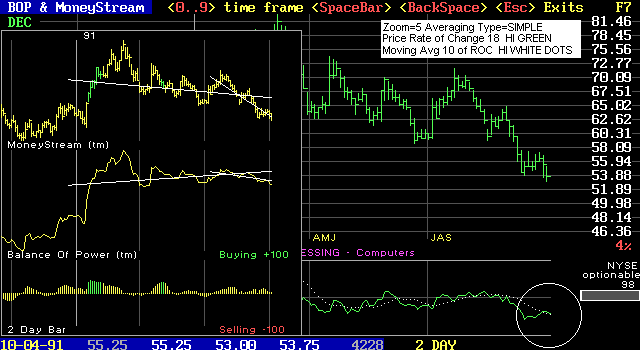 Pull-up a daily chart of DEC with indicator module number 1. Clip it back to 10/2/90. You will recall we are still in a hypothetical short trade, which we entered four months earlier on 6/1/90.